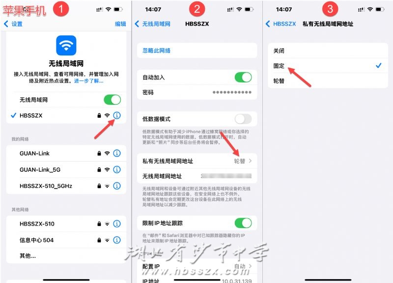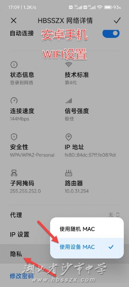 通过沙市中学校园网上网的个人用户设备,一律实行实名认证。用户设备首次上线时,系统自动进行 MAC 地址(即私有无线局域网地址)绑定。绑定的 MAC 地址累计超过一定数量时,对新上网设备拒绝连接外网。目前,大多数移动上网设备(指通过无线上网的手机、平板电脑等),默认采取动态或随机 MAC 地址的方式连网,以便对设备进行隐私保护。这一机制与上网认证机制有一定的冲突,表现为用户登记的 MAC 地址数量在短期内会突破上限,导致很快被系统拒绝登录。为避免这一冲突,用户需将登录校园网的无线连接项(仅指连接“HBSSZX”WIFI 的项目)设置为“固定 MAC 地址”(或选“关闭”)才能长期稳定连接校园网,设置方法见下图。