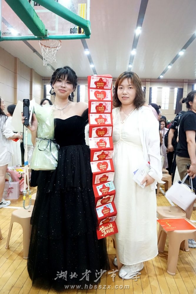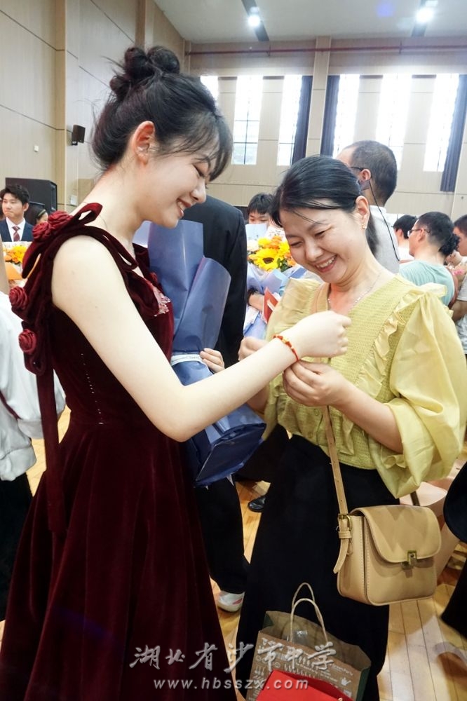 学生代表向家长代表献花后,全场迎来最温情的时刻——家长为孩子送上象征成人的“成人卡”,卡片上或写着父母的叮咛,或封存着成长的照片;孩子们则双手捧上精心准备的礼物,有的是一束花,有的是一份手工制品,随后深深鞠躬,向父母致以最崇高的敬意。当《是妈妈是女儿》的旋律响起,家长与孩子互赠信件,现场阅读,有的默默拭泪,有的紧紧相拥,千言万语化作无声的爱意,在彼此心中流淌。