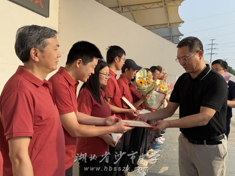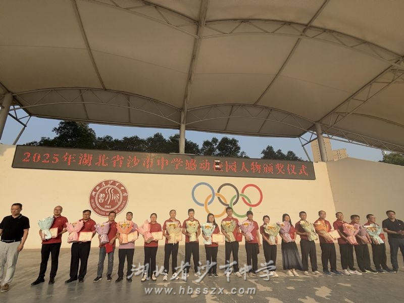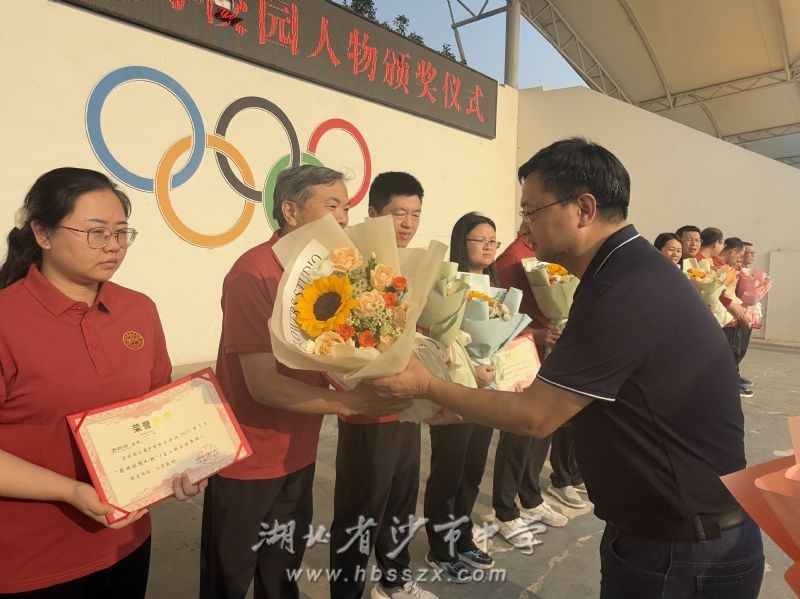 2025年5月26日清晨,沙市中学隆重举行了“感动校园人物”颁奖仪式,表彰2022级高三年级班主任团队的卓越贡献。学校党委书记熊礼才为团队颁发荣誉证书,党委副书记、校长徐善慧为他们献上鲜花,全体师生共同见证了这一荣耀时刻。