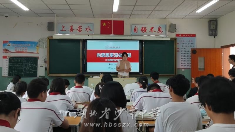语文组江露露老师的课题为《向思想更深处漫溯》。课堂围绕“二元对立作文”进行写法探究,从“解读原材料、写好‘关系’、我思故我在”三步展开教学。江露露老师梳理了“A+B+AB”与“AB+BA”的思维模式,通过展示思维导图、讲解优秀范文等方式总结二元对立作文中的“规定动作”和“自选动作”。