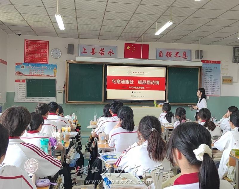 语文组黄嘉懿老师的课题为《句意通幽处细品悟诗情——古代诗歌专题赏析》。黄嘉懿老师以杜甫《绝句》中“两个黄鹂鸣翠柳,一行白鹭上青天”导入,通过学生打乱语序重新组合的方式,梳理古代诗歌的“单句、紧缩句、连贯句、名词句、错位句”五种句型,并从诗句的分层训练中总结诗歌鉴赏的学习方法。课堂设计新颖,层层递进,学生参与度高。