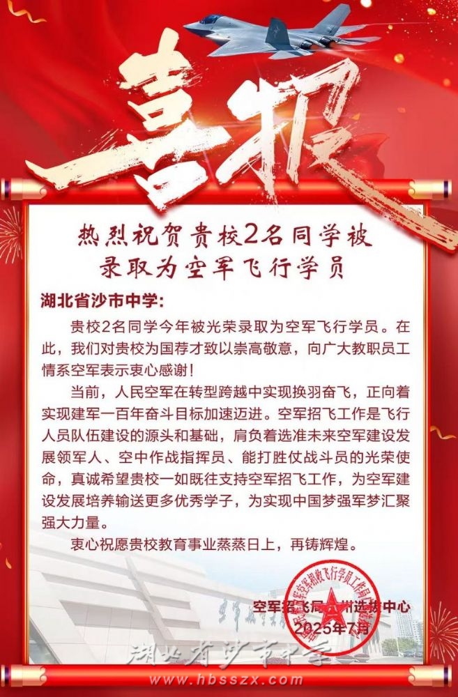 喜报!沙市中学 2 名学子被录取为空军飞行学员