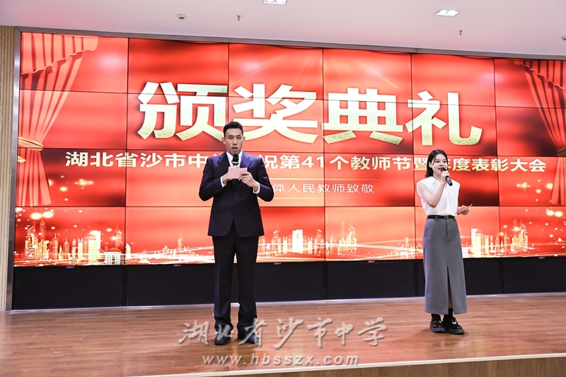 主持人为我校青年教师 朱克汉 邵小倩 细雨润庭,暖意盈堂。2025年9月10日下午4时,淅淅沥沥的雨声为校园平添了几分温婉,湖北省沙市中学综合楼二楼报告厅内暖意融融,庆祝第41个教师节暨年度表彰大会在此隆重举行。全体教职工齐聚一堂,共庆属于教育工作者的光荣节日,共同展望学校教育事业发展的崭新蓝图。