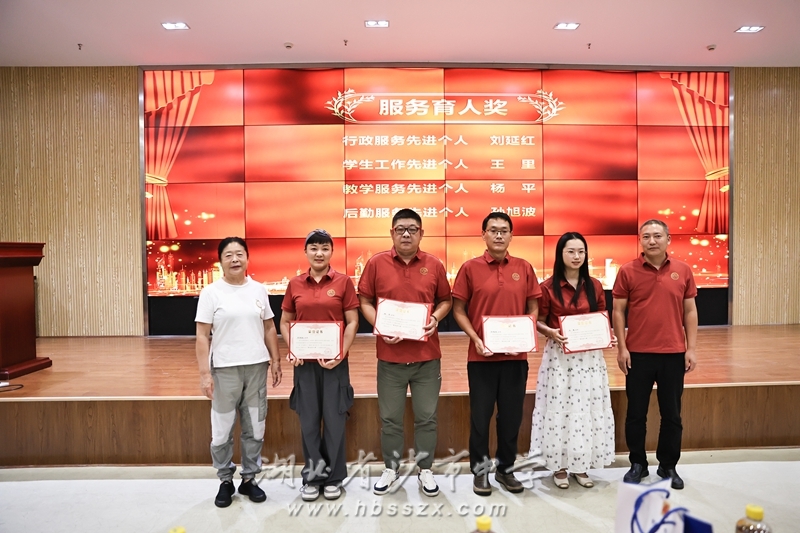 颁发“服务育人奖” 在“颁奖环节1”中,“管理奉献奖”“宣传工作奖”“优秀教研组长、备课组长”“招生先进个人”等奖项陆续颁发,湖北菲利华石英玻璃股份有限公司财务总监魏学兵与徐善慧校长为获奖者颁奖。“服务育人奖”则表彰了在行政、学生工作、教学服务和后勤保障中表现突出的教职工,退休教师代表、特级教师周琼与副校长唐年新为获奖者颁奖。