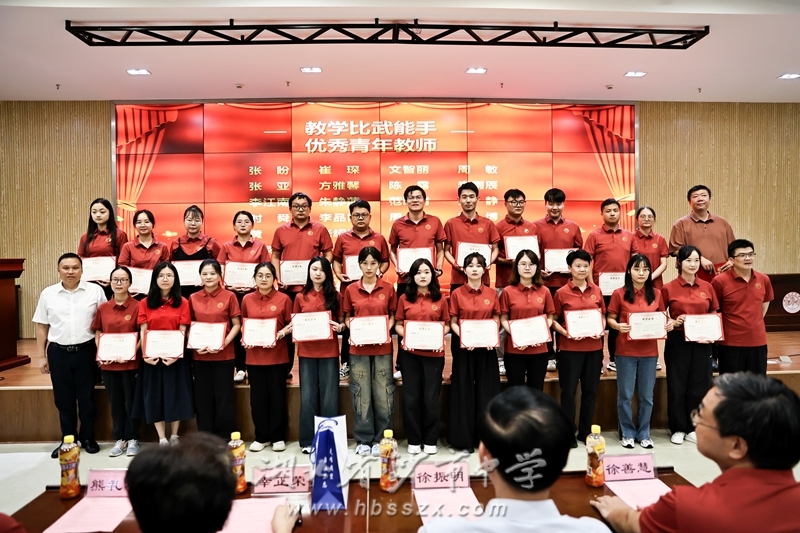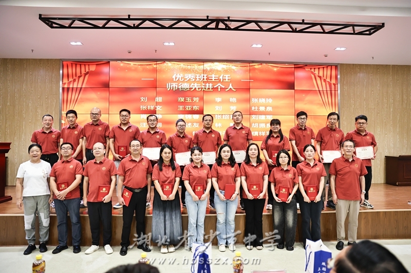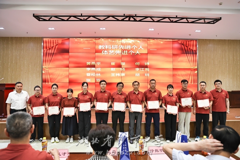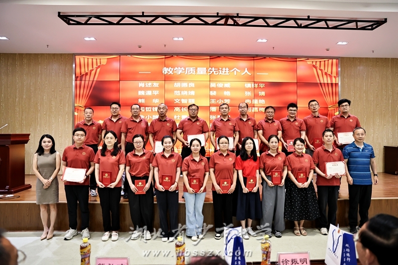 颁发“优秀班主任和师德先进个人奖” “颁奖环节2”集中表彰了在教学一线取得优异成绩的教职工。“教学质量先进个人”奖项中,肖述友、胡振良等21位教师凭借在高考中的突出表现获此殊荣,刘昌梅、余小路等7位教师因指导学生获学科竞赛省一等奖而同获表彰,湖北精极阀门集团有限公司董事长、沙市中学98届校友吴芙蓉与副校长赵文华为他们颁奖并向他们致以热烈祝贺。随后,崔琛、文智丽等22位教师获评“教学比武能手、优秀青年教师”,2024级数学备课组等4个集体及崔琛、赵杨等14位个人分获“优秀备课组、教科研先进个人、体艺先进个人”称号,荆州市先隆包装制品有限公司邹乐新与副校长潘磊为获奖者颁奖,鼓励他们在教学科研道路上持续精进。在“优秀班主任和师德先进个人”表彰中,刘超、濮玉芳等21位教师上榜,他们以高尚的师德、扎实的工作赢得师生认可,沙市中学退休教师代表、特级教师周琼与副校长胡直为他们颁发荣誉证书。