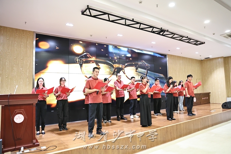 中华人民共和国国歌响起,全体教师用激昂的歌声表达自己的爱国情怀与责任担当。
