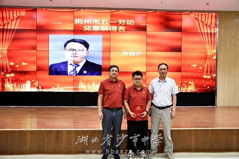 为获得荆州市“五一”劳动奖章的张绍开老师颁奖