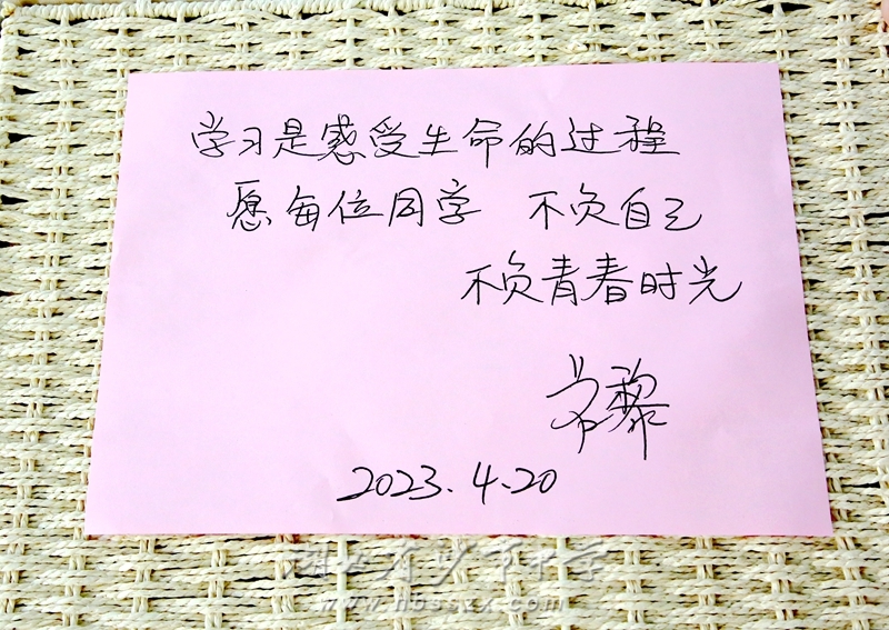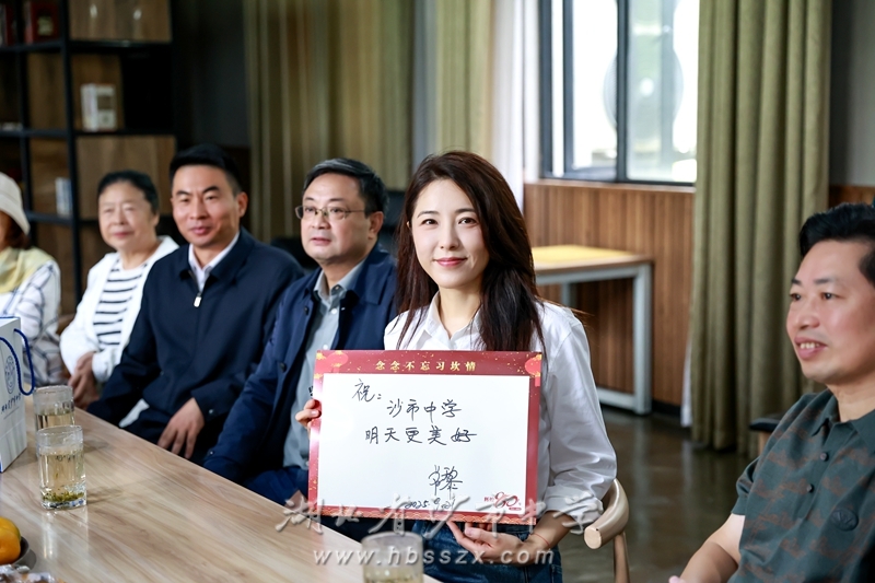 在习坎楼会客室,曾黎在留言簿上写下:“祝沙市中学明天更美好”,表达对母校的深厚情谊和美好祝愿。