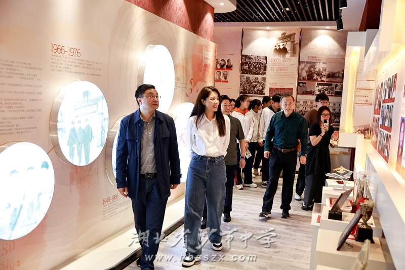 在裴毅、卢永桢、徐善慧等人的陪同下,曾黎一行从东门进入校园,沿途经东门广场、院士墙、教学楼、运动场等地,详细了解了校园新貌,并参观了学校“五育并举”教育成果展及学生社团活动展示。曾黎表示,这是她第一次来到母校新校区,深感校园环境优美如花园,绿化景观宜人。她特别赞赏学校在高考、学科竞赛、科技制作和体育艺术等方面取得的优异成绩,并对学生活动丰富多样、甚至设有劳动实践基地表示惊喜。她认为,沙市中学为学生提供了多元成长路径和全面发展的平台。徐善慧校长向曾黎介绍了学校的办学特色、近年成就以及未来发展规划。