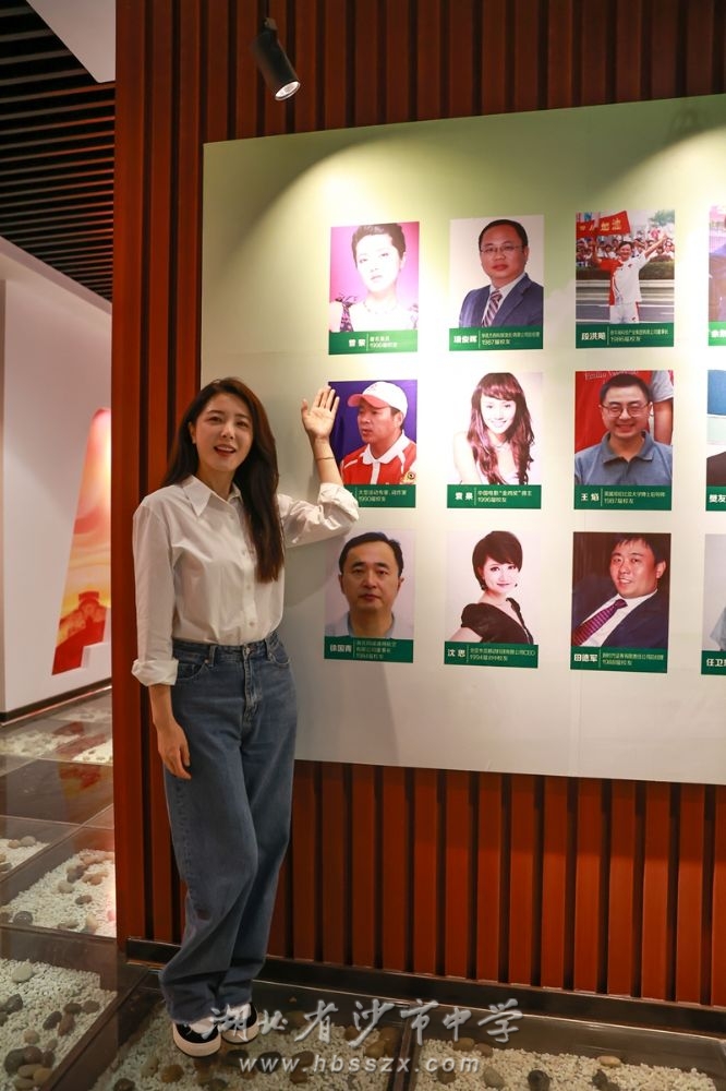 在校史馆,曾黎在自己作为杰出校友的介绍展板前合影留念。