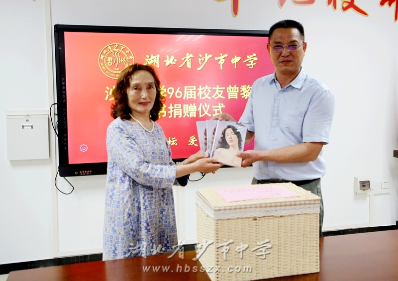 2023年4月20日,沙市中学党委书记、校长熊礼才同志代表学校接受曾黎委托母亲沈克珍女士捐赠个人自传《顺风而生》
