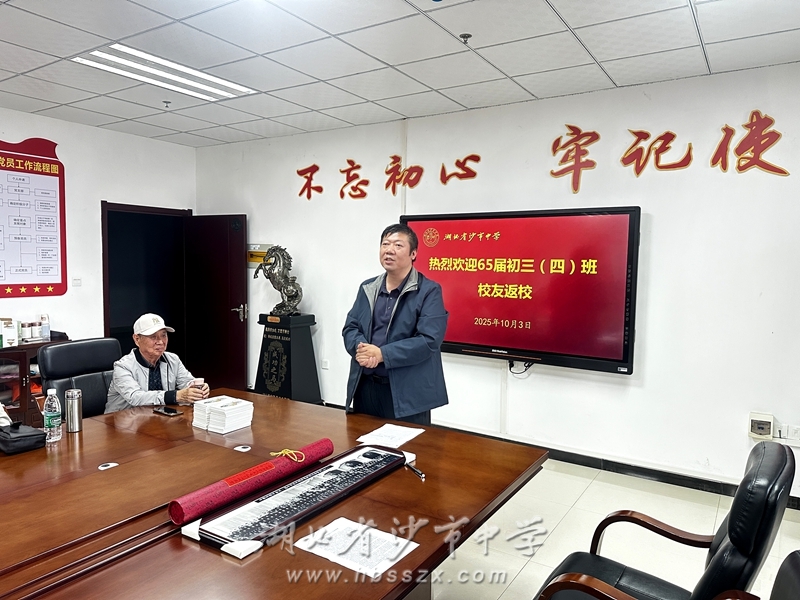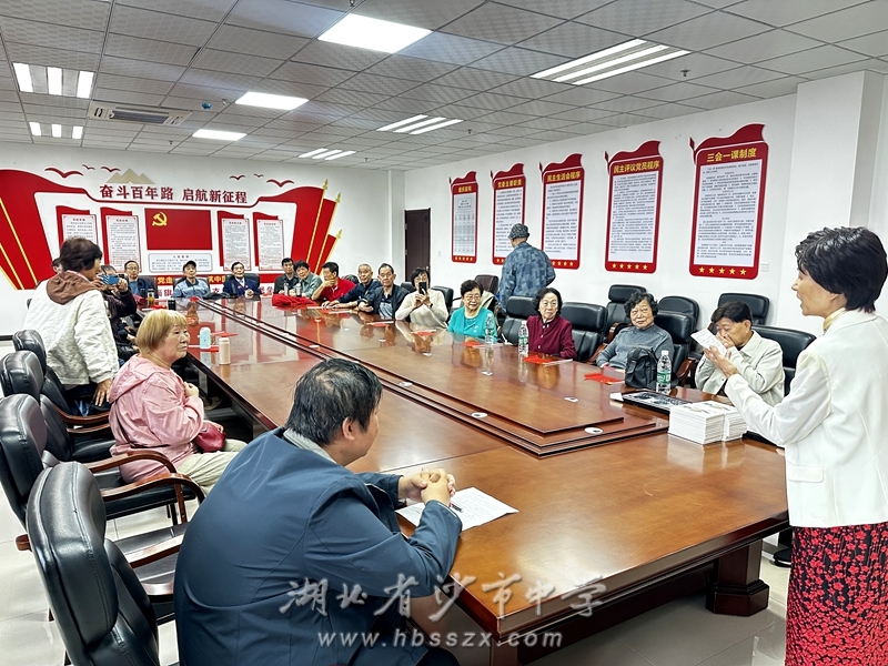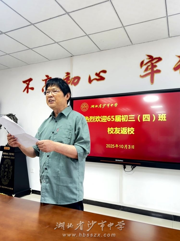 党委委员、副校长张珺讲话 10月3日,正值祖国76周年华诞之际,沙市中学1965届初三(4)班近30名校友跨越一甲子时光重返母校新校区,举行毕业60周年感恩聚会。沙市中学党委委员、副校长张珺,校友办主任胡明到场热情接待,与老校友们共忆青葱岁月,共话母校发展。