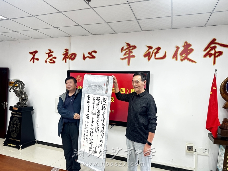 随后,班主任倪正明老师发言,与同学们重温当年的教学点滴,寄语大家保重身体,延续同窗情谊。现场还举行了简朴而庄重的捐赠仪式:倪正明老师向学校赠送了1985年全国第一届物理竞赛授奖大会合影照片,将珍贵的校史资料留存母校;知名书画家王君琦校友则捐赠了精心创作的书法作品,以笔墨寄深情,彰显对母校的赤子之心。