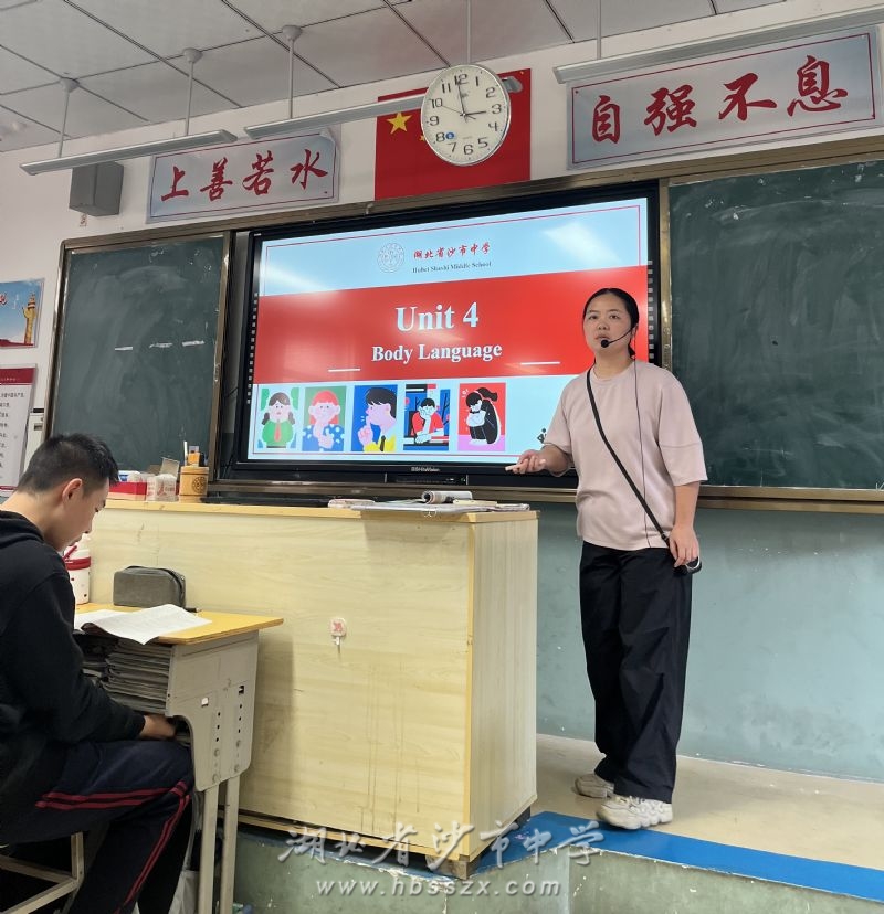 张媛媛老师授课 英语组张媛媛老师执教《BodyLanguage》,以“肢体语言的文化内涵与实际应用”为核心,通过图片分析、无声表演等互动活动激发学生兴趣,引导学生观察、演绎并解读肢体语言的文化差异与共性。通过标题预测、主旨梳理、小组表演等环节,学生逐步构建文本知识体系,并在实践中锻炼表达能力。课堂体现“观察—体验—探究—应用”的教学逻辑,以学生为中心,注重体验与探究,师生在合作中共同突破跨文化交际的认知壁垒,展现互动式教学的活力。