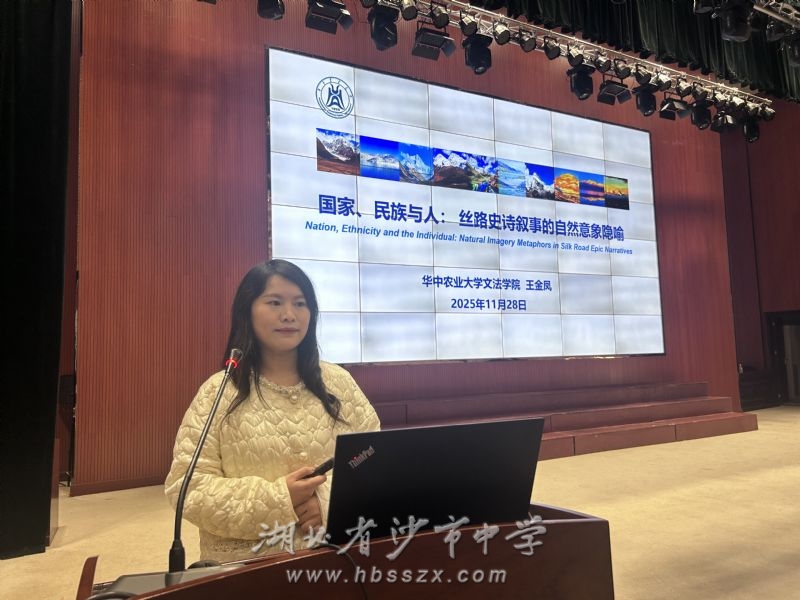 11月28日下午,华中农业大学文法学院副研究员王金凤受邀走进沙市中学习坎讲坛,在学术报告厅为高一学子带来了一场以《国家、民族与人:丝路史诗的自然意象隐喻》为题的精彩分享,在古老史诗的恢弘叙事中探寻文明密码。