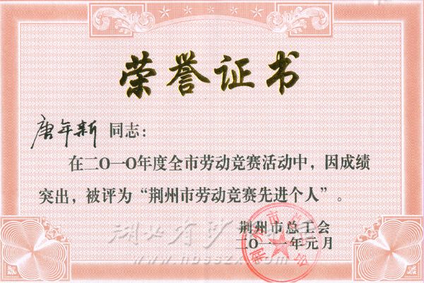 近日,在荆州市总工会主办的“2010年度荆州市劳动竞赛评比”活动中,我校被评为“市劳动竞赛先进单位”,唐年新老师被评为“先进个人”。