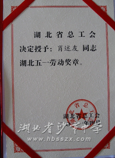 “五一”国际劳动节来临之际,沙市中学教师肖述友获得湖北省总工会颁发的“五一劳动奖章”。