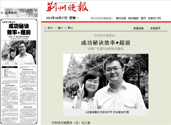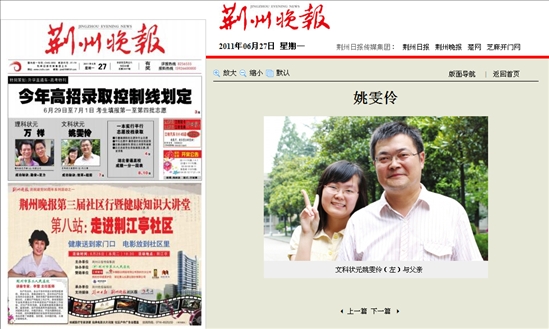 其实,姚雯伶的理科成绩也是很优秀的。升入高中前,在沙市一中教物理的父亲姚会希望女儿“继承父业”,但是最后还是尊重了孩子的决定。这一决定让姚雯伶在文科生中凸显出优势。