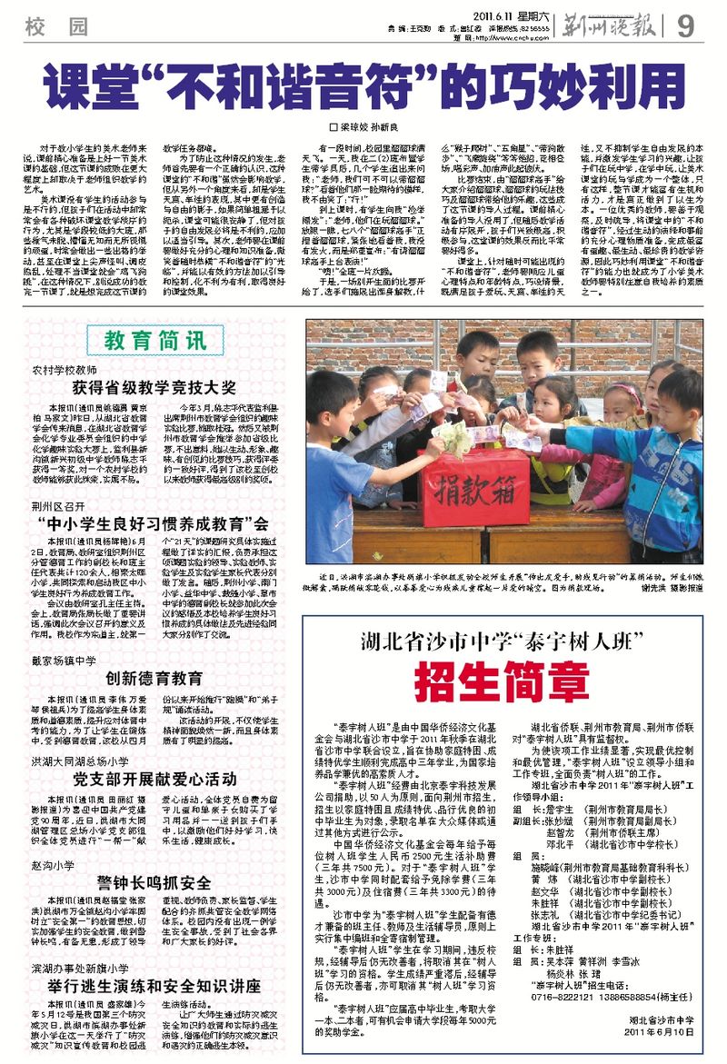 《荆州晚报》(2011年6月11日第9版)报道我校"泰宇树人班"招生简章