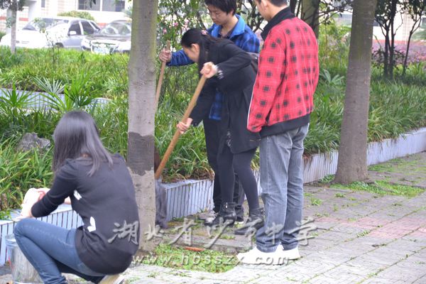 与此同时,高二(15)班的同学在学工处主任吴本萍和班主任胡晓红老师的带领下在校园内部开展了校园清洁大扫除活动。同学们分工协作,有的扫道路,有的抹花坛,有的除杂草,将校园的主干道及两侧的绿化带打扫得焕然一新。