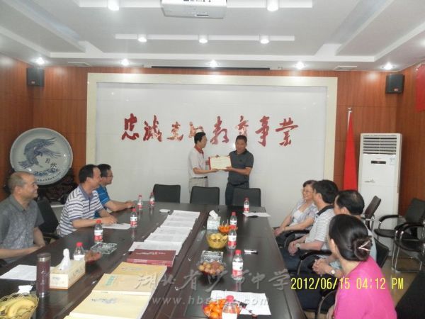 颁发证书 6月15日下午4时,邓北平校长授予湖北菲利华石英玻璃股份有限公司董事长邓家贵编号为001的湖北省沙市中学荣誉校友称号,并向其颁发了荣誉校友证书。邓家贵先生也成了我校第一位荣誉校友。湖北省沙市中学荣誉校友是依据《湖北省沙市中学荣誉校友实施办法》综合评定而遴选出的长期以来关心、爱护和支持学校发展但未能直接在我校学习、工作和生活过的社会各界人士。