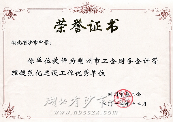 2012年12月获评荆州市工会财务会计管理规范化建设工作优秀单位