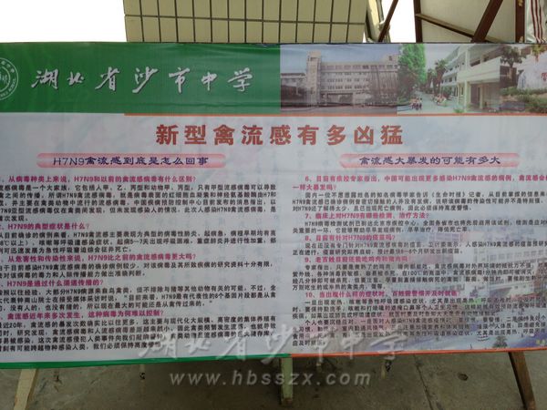 近日,来势汹汹的H7N9禽流感逐渐扩散,多个城市受到禽流感的袭击。为了防止学校受到流感病毒侵袭,保证师生的生命健康,4月10日上午,我校特召开行政会研究预防措施,制定《H7N9禽流感防控预案》,提请学校各部门一定要重视,并严格按照预案要求做好防范准备。随后,我校组织各班级进行全校清洁大扫除,并做好消毒工作。制作《新型禽流感有多凶猛》的展板,对师生展开预防教育。从意识教育和行动方面采取全方位切实可行的措施,一定要把禽流感挡在校门之外!