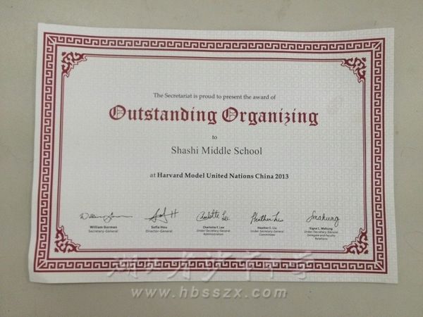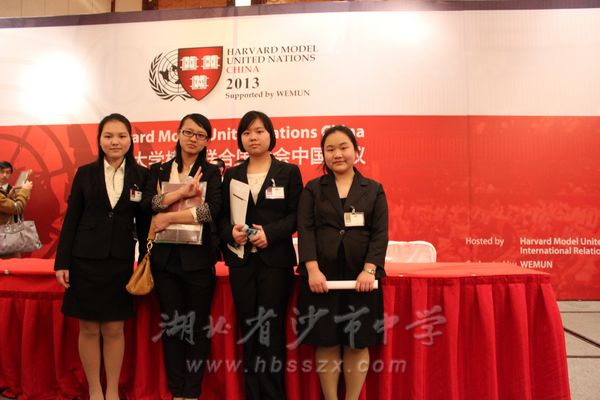 2013年3月底,我校高二(16)班陈立雪、郑启迪、肖雅欣、熊时羽四名同学赴北京参加了2013年哈佛大学模拟联合国大会中国会议。陈立雪、郑启迪同学在联合国安全理事会任德国代表,肖雅欣、熊时羽在联合国历史安全理事会任哥斯达黎加代表。