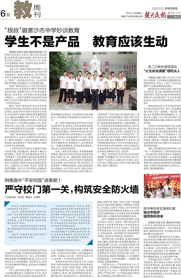 《楚天民报》5月28日6版:"根叔"作客沙市中学妙谈教育 学生不是产品 教育应该生动
