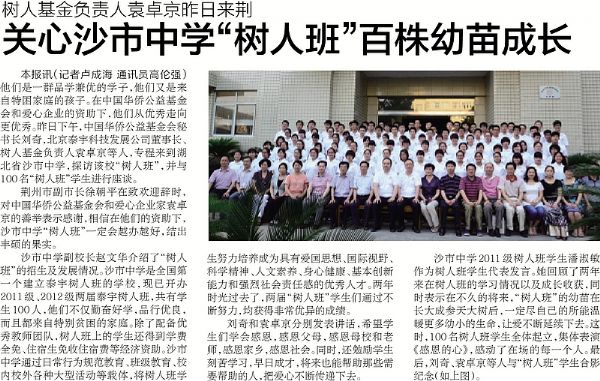 《楚天民报》6月14日第6版:树人基金负责人袁卓京昨日来荆 关心沙市中学"树人班"百株幼苗成长