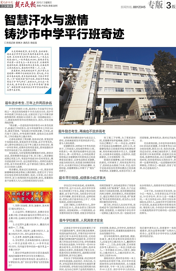 《楚天民报》7月3日第3版:智慧汗水与激情铸沙市中学平行班奇迹